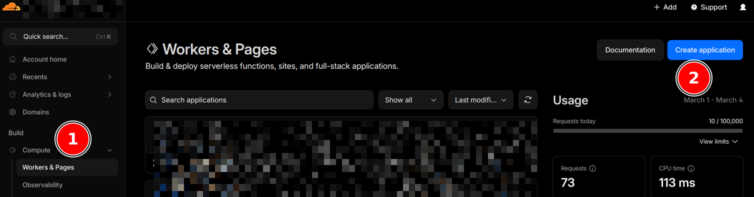 Let's switch over to our Cloudflare dashboard. Go to Create application under Compute, Workers & Pages.