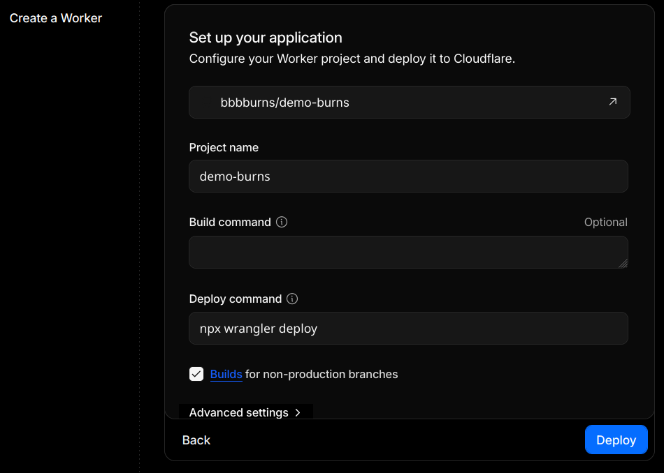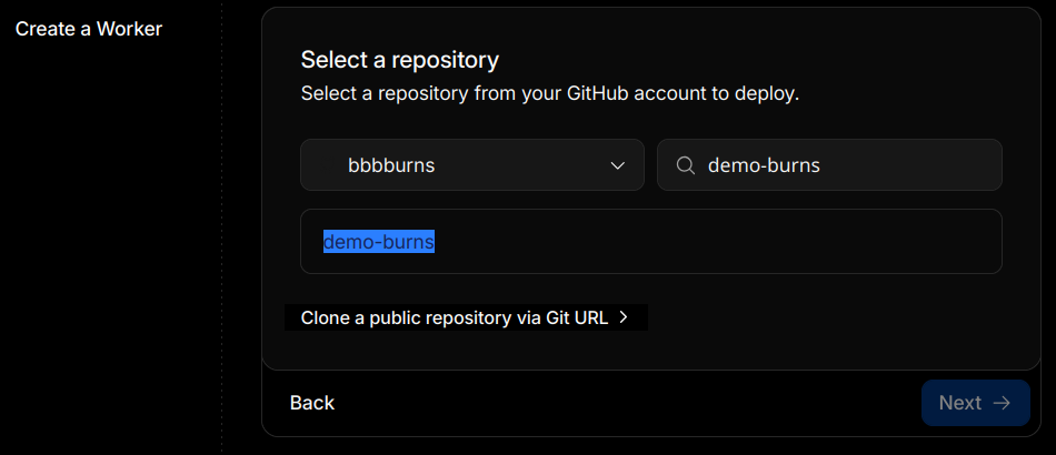 Then back in our Cloudflare Worker setup, we can see this repo now.