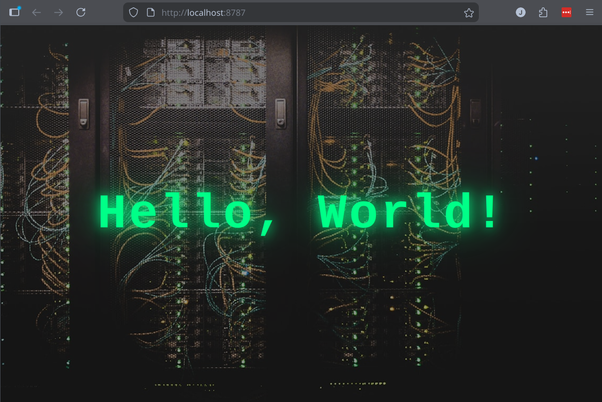 - index.html — full-viewport hero image with a green terminal-style "Hello, World!" overlay (monospace font, glow effect, darkened image for contrast)