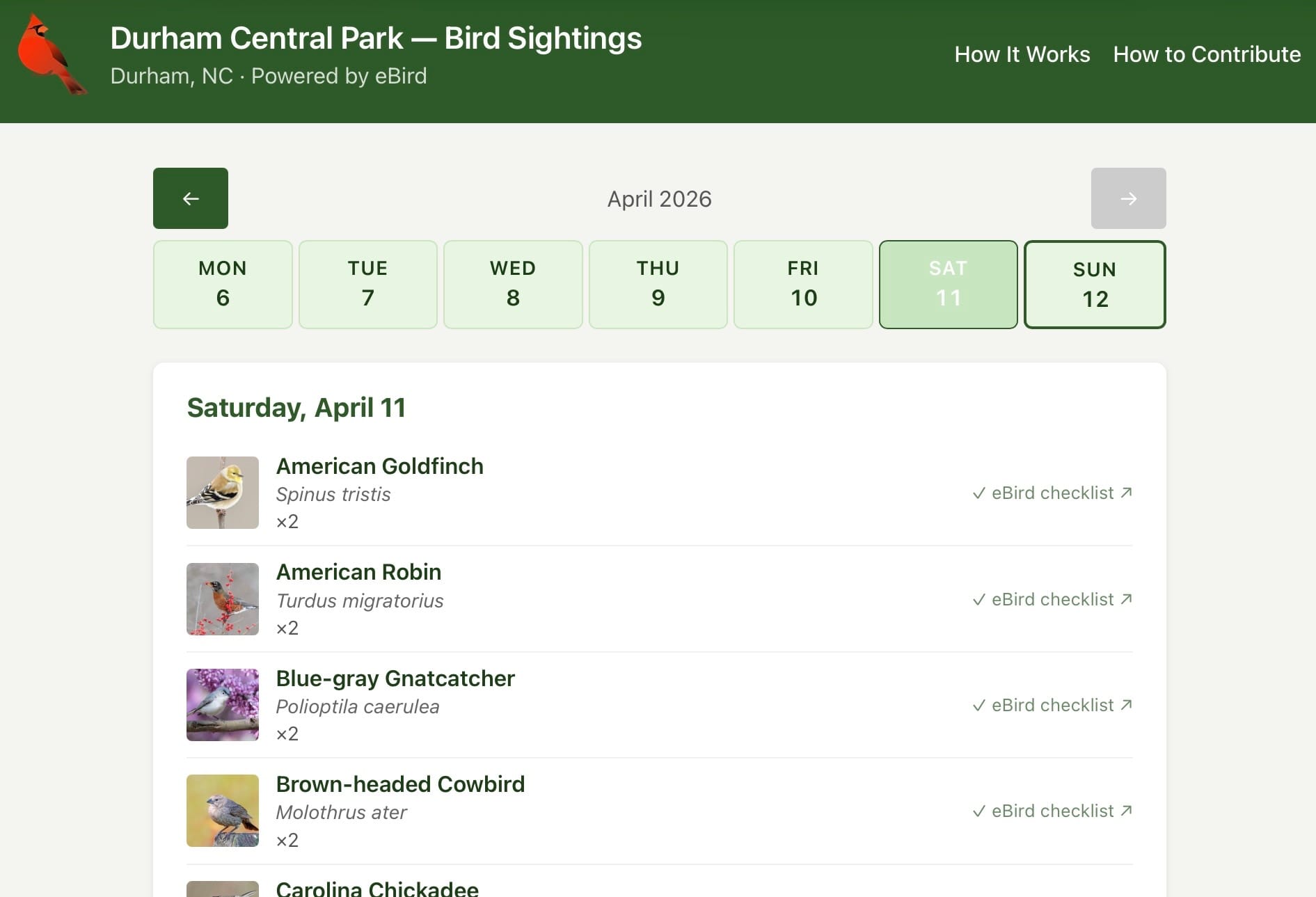 Now everyone who lives near Durham Central Park can view the birds submitted to eBird in a very simple way. No login needed. Just a simple list of birds.